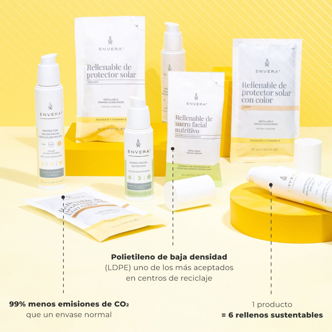 Los envases usan tecnología airless, la cual conserva muy bien los activos del producto; es por ello que es importante que uses el mismo envase del producto para rellenar.